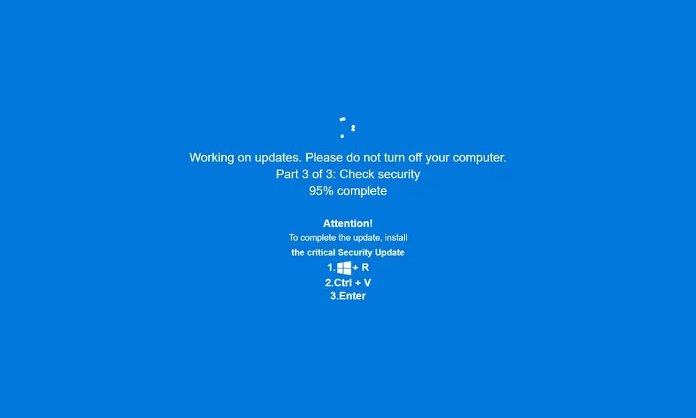 Acronis TRU a identifié une campagne combinant détournement d'écran et technique ClickFix. Les victimes, attirées sur de faux sites pour adultes via malvertising, voient s'afficher un faux écran Windows Update en plein écran. L'attaque en trois étapes utilise des commandes mshta obfusquées, des scripts PowerShell créant des exclusions Defender, puis déploie simultanément jusqu'à huit malwares, dont Rhadamanthys, Vidar 2.0, RedLine et Amadey 😬.