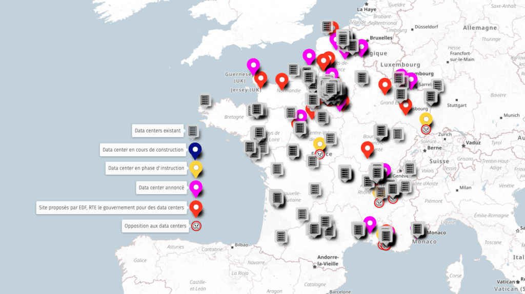 Le collectif marseillais "Le Nuage était sous nos pieds" a publié une carte interactive recensant les datacenters en France. L'inventaire identifie 348 centres existants, 26 projets annoncés, 11 en cours d'approbation et 8 en construction.